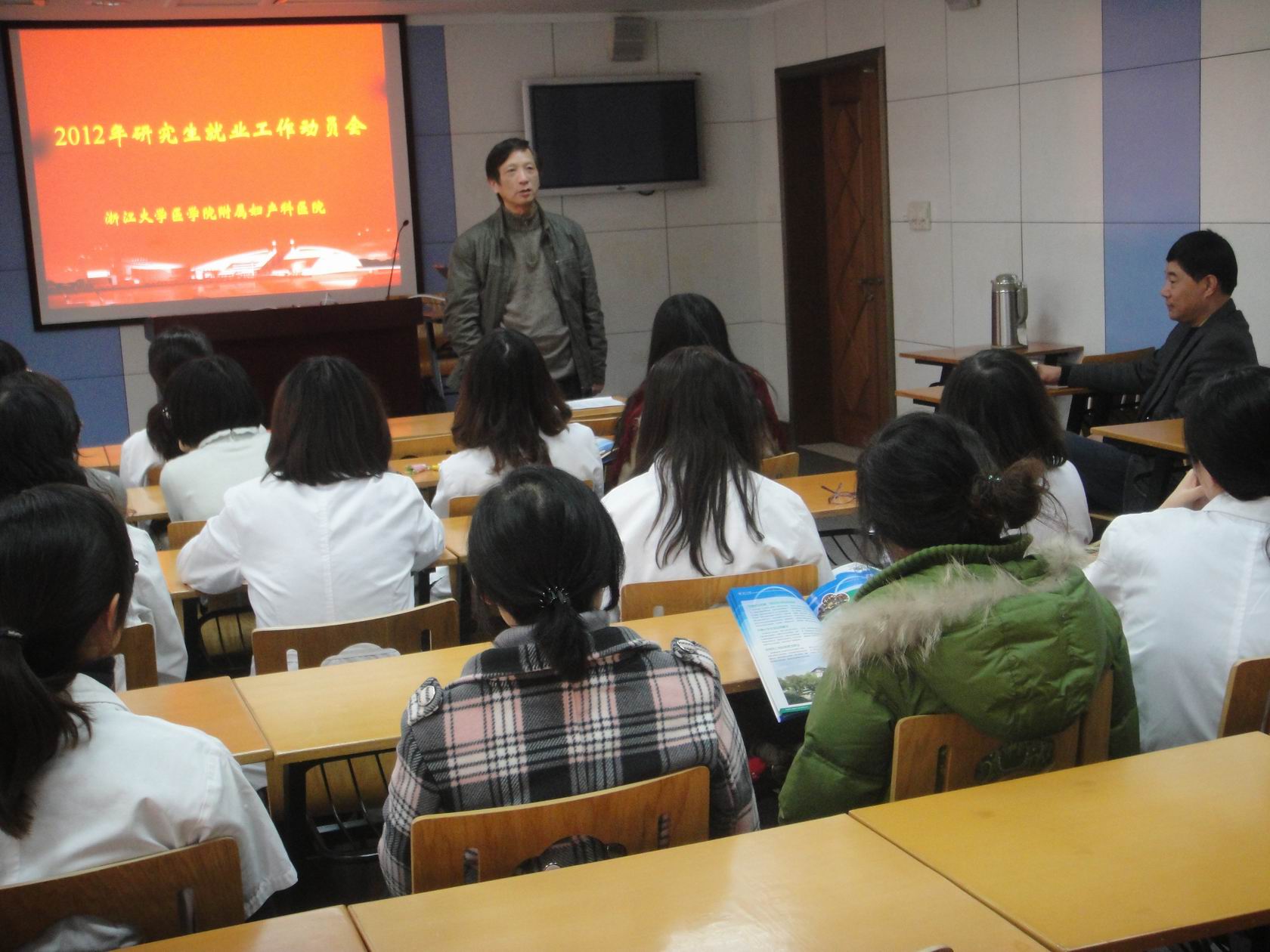 最后,医学部华家池学生党总支汪书记为同学们就业形势做了全面的解析,并与去年的就业情况做了对比。去年我院研究生的就业率为100%,希望今年我院的就业率再创佳绩。他谈到虽然每年毕业的学生逐年递增,但是2012年对毕业生的需求仍然较旺盛,尤其是妇产科医学生。其次,就妇产科学生就业去向问题,汪书记给与会同学做了深刻分析。他希望各位同学能够站在国际水平的高度,以国际视野规划自己未来的人生道路,调整好心态,做好人生定位,往高层次发展。提醒未完成信息核对的同学抓紧时间进行生源信息核对与审核,并且例举往年具体案例强调了诚信的重要性,再次提醒即将毕业的同学们应慎重签约,慎重违约,切勿弄虚作假,自作聪明。