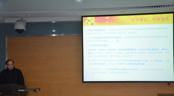 邵吉民书记将基础医学系贯彻落实党的群众路线从总体情况、学习教育和听取意见、查摆问题和开展批评、系领导班子对照“四风”的主要问题以及整改落实等五大方面向基础医学系师生做了汇报。