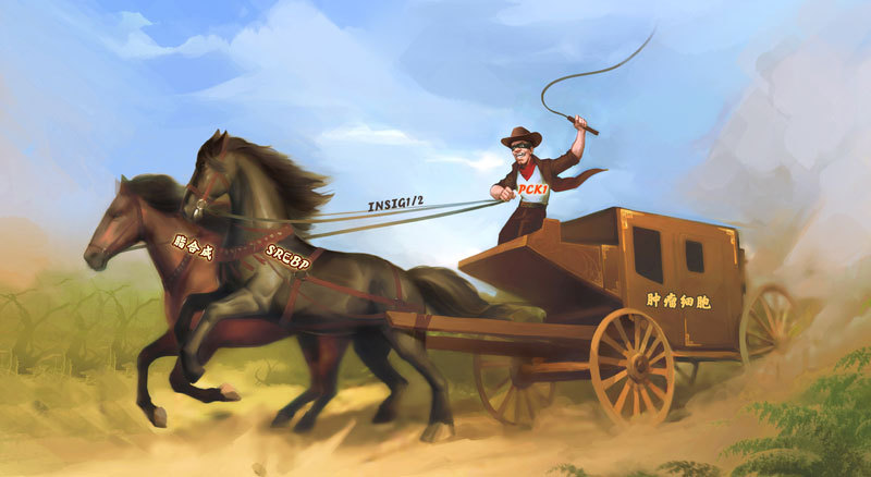 在正常的细胞中,脂质合成受到负反馈调节。当正常细胞的脂质到了一定水平,脂质就会结合到内质网跨膜蛋白INSIG1/2,联手锁住控制脂质合成的关键转录因子SREBP及其护送蛋白SCAP。这样一来,关键转录因子SREBP就被锚定在了内质网中,无法进入细胞核传达生产脂质的指令,脂质合成也就被抑制了。
