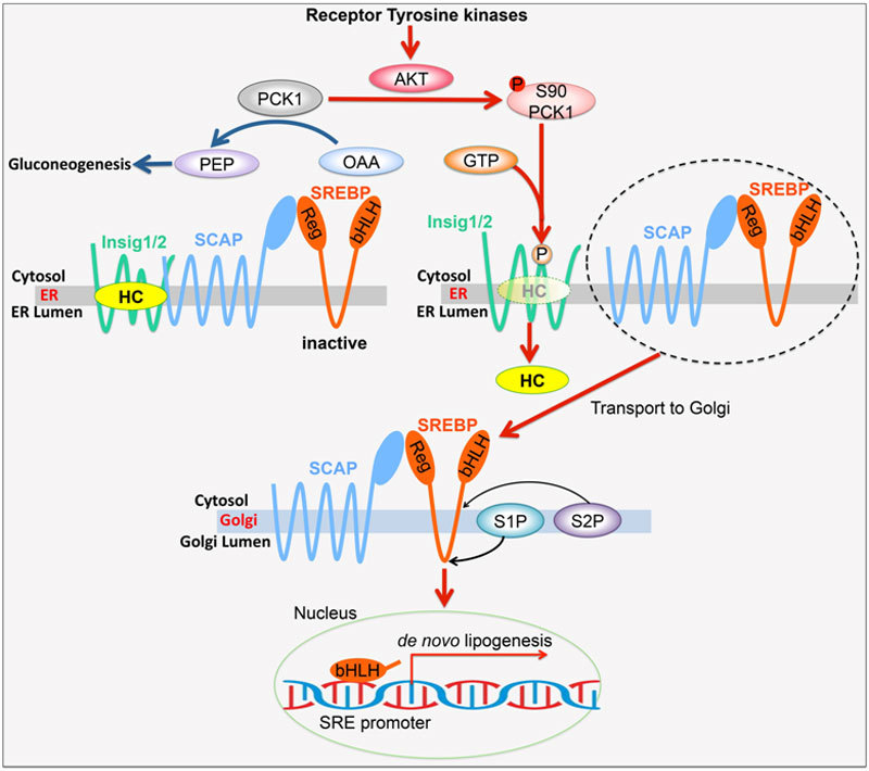 PCK1摇身一变,以GTP作为磷酸基供体磷酸化INSIG1/2使其与细胞内脂质的结合出现障碍,进而促进SREBP信号通路的激活及肿瘤细胞的脂质合成。