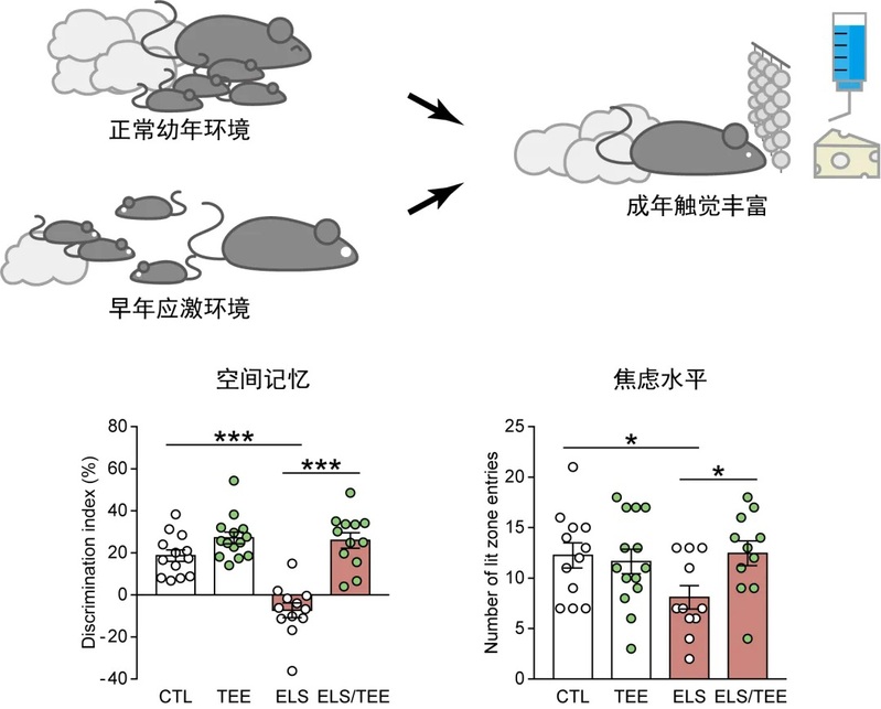 其次,课题组采用限制筑窝材料与垫料的早年应激模型,发现出生后早期经历应激的小鼠在成年后出现空间记忆损害、焦虑水平升高,而早年应激对认知和情绪的不良影响可被成年期触觉丰富有效缓解。