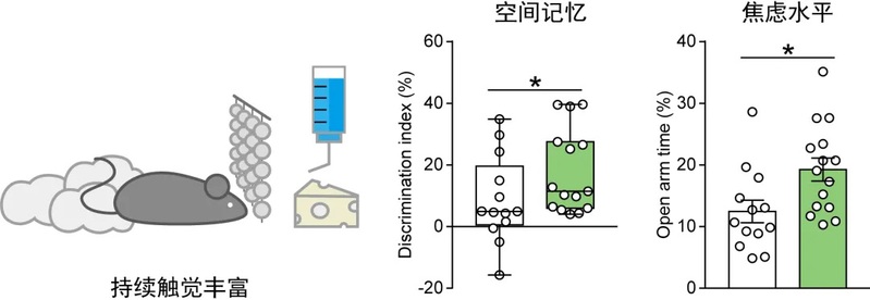 首先,课题组通过在小鼠饲养笼内悬挂玻璃珠帘的方式,使小鼠在自由活动状态下频繁接触温和的触觉刺激。持续的触觉经历丰富可显著提升小鼠在空间物体识别测试和高架十字迷宫测试中的行为表现,表明触觉丰富具有促进空间记忆、缓解焦虑样行为的作用。