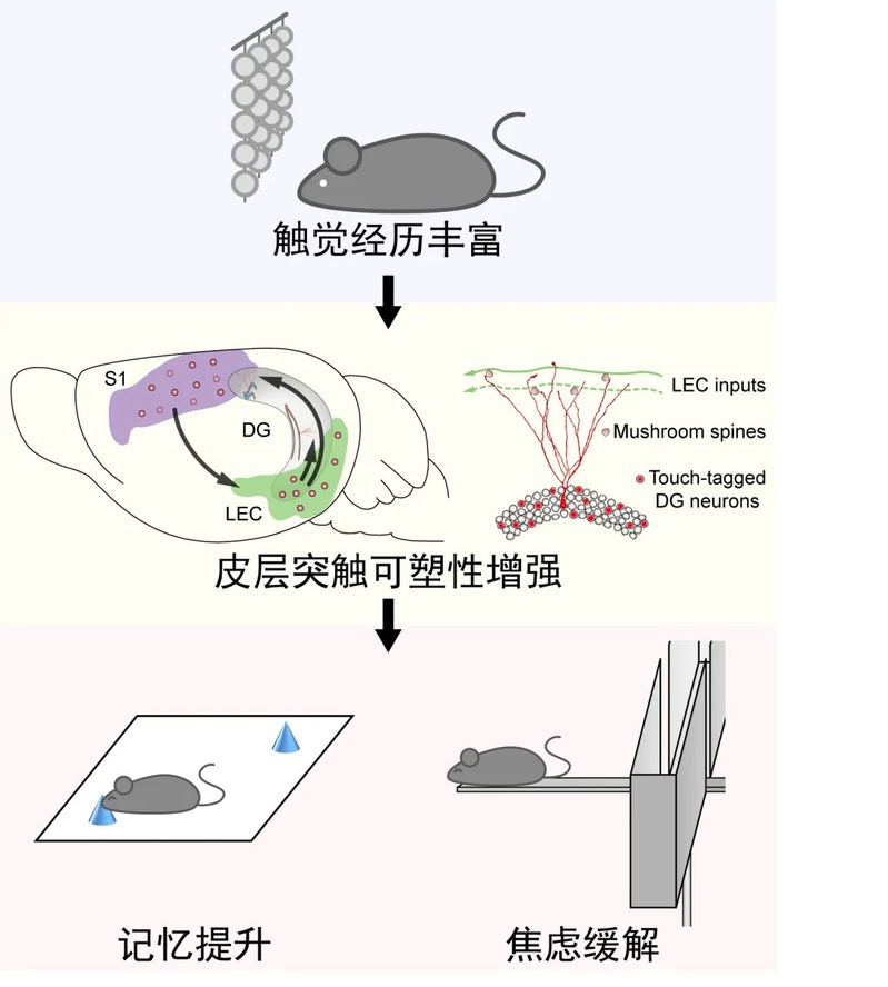 随后,课题组采用高尔基染色和活动神经元标记等技术,发现触觉丰富通过初级躯体感觉皮层(S1)→外侧内嗅皮层(LEC)环路,差异性调控小鼠背/腹侧齿状回(DG)神经元的突触可塑性。人为激活触觉经历印迹DG神经元可以模拟触觉丰富对记忆和焦虑的调节作用,而抑制这群DG神经元或者接受S1投射的LEC神经元则阻断了触觉丰富的作用。