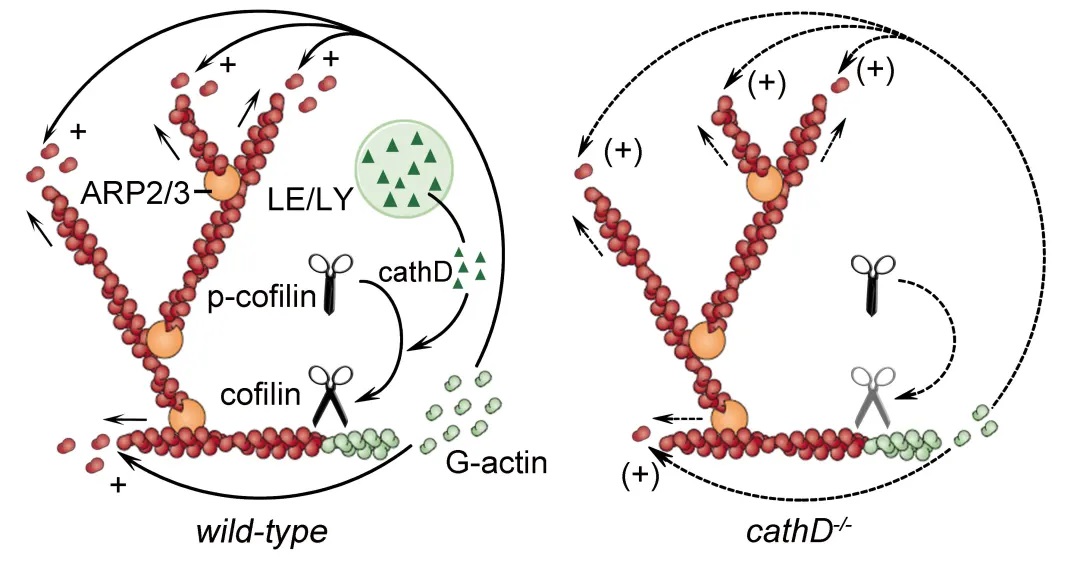 该研究首次发现内吞体-溶酶体囊泡具有调节微丝细胞骨架动态组装的功能。其中,晚期内吞体在小胶质细胞迁移过程中,发挥微丝骨架“拆迁加速器”的作用,通过向胞浆释放未成熟cathepsin D调控cofilin介导的微丝骨架重组,维持小胶质细胞定向迁移。