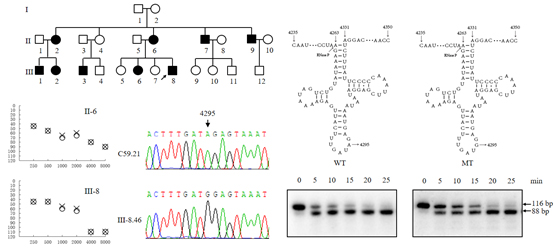 本研究针对中国汉族2651个耳聋病人以及574个正常对照进行线粒体基因测序分析,鉴定了位于线粒体tRNAIle反密码子环37m.4295A>G突变。该家系呈现明显的母系遗传模式,14个母系成员中9人表现出不同程度的听力损伤,发病年龄23-50岁,未发现其他临床表现。序列分析表明母系成员中m.4295A>G突变均为同质性突变。Primer extention实验和体外修饰酶Trm5催化实验表明m.4295A>G引入了新的m1G37修饰,改变了原有的t6A37修饰,同时导致tRNAIle反密码子环的构象变化(Molecular Dynamics)。线粒体tRNA前体5’端体外酶切实验分析表明,该突变影响了RNase P催化的线粒体tRNAIle前体的5’末端加工效率。此次研究发现也是管敏鑫教授围绕“线粒体tRNA转录后剪切加工异常导致母系遗传性耳聋分子机制”相关研究(Nucleic Acids Res 2020)的另一重大突破,是对该理论补充的又一强有力的证据。