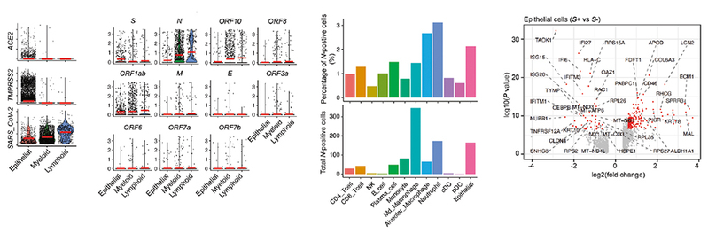 该研究进一步从单细胞转录组数据中分析出病毒特异性基因的表达(图3),并发现新冠病毒基因不仅在被感染的上皮细胞中表达,也在多种免疫细胞中表达。更有意思的是,新冠病毒的11种主要基因呈现出差异性表达,比如S基因主要在上皮细胞中表达,而N和ORF10等在免疫细胞中的丰度更高。进一步分析发现表达S基因的上皮细胞出现了增强病毒复制与增殖的免疫逃逸现象,而表达N基因的中性粒细胞则出现了显著的先天性免疫激活,提示中性粒细胞在主动清理病毒过程中发挥重要作用。但此类中性粒细胞同时表达大量炎症细胞因子并表现出长时间不受控制的激活状态,这可能是导致细胞因子风暴和重症进展的主要元凶。