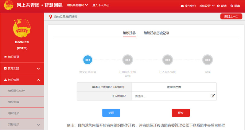 1. 各临床医学院研究生团总支在智慧团建系统-组织管理-组织迁移发起申请;