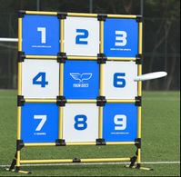 在距离九宫格3m外的位置投掷飞盘,击落九宫格中的板块并连接成线。