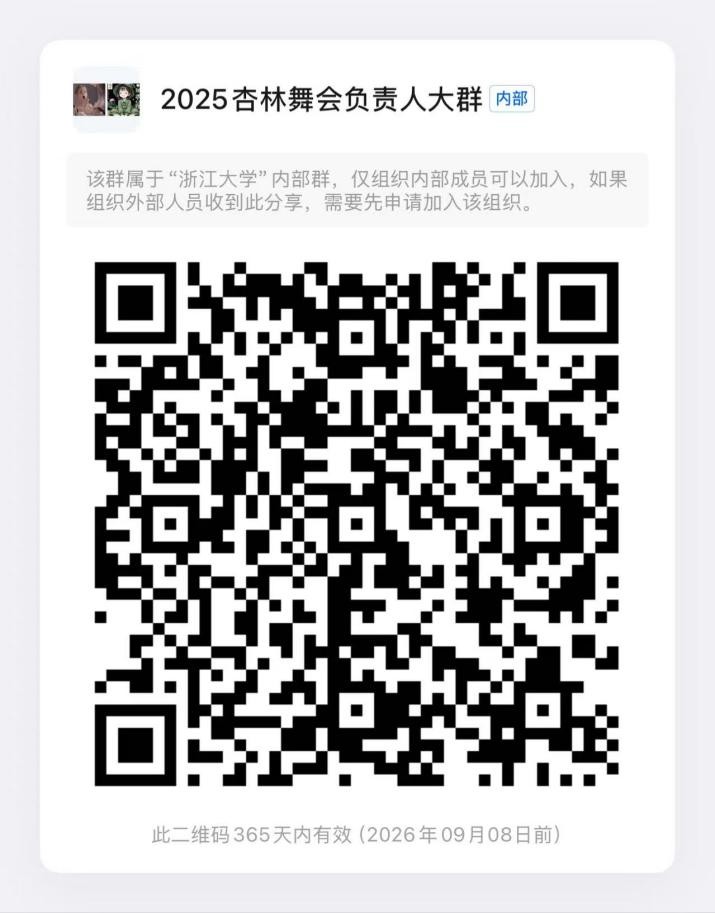 ①请各班选出一名负责人,便于后期通知联系,并于9月24日12:00前,加入下方舞会负责人钉钉群,根据群内通知将负责人相关信息(姓名、专业班级、电话、QQ等)发送至舞会对接人处。